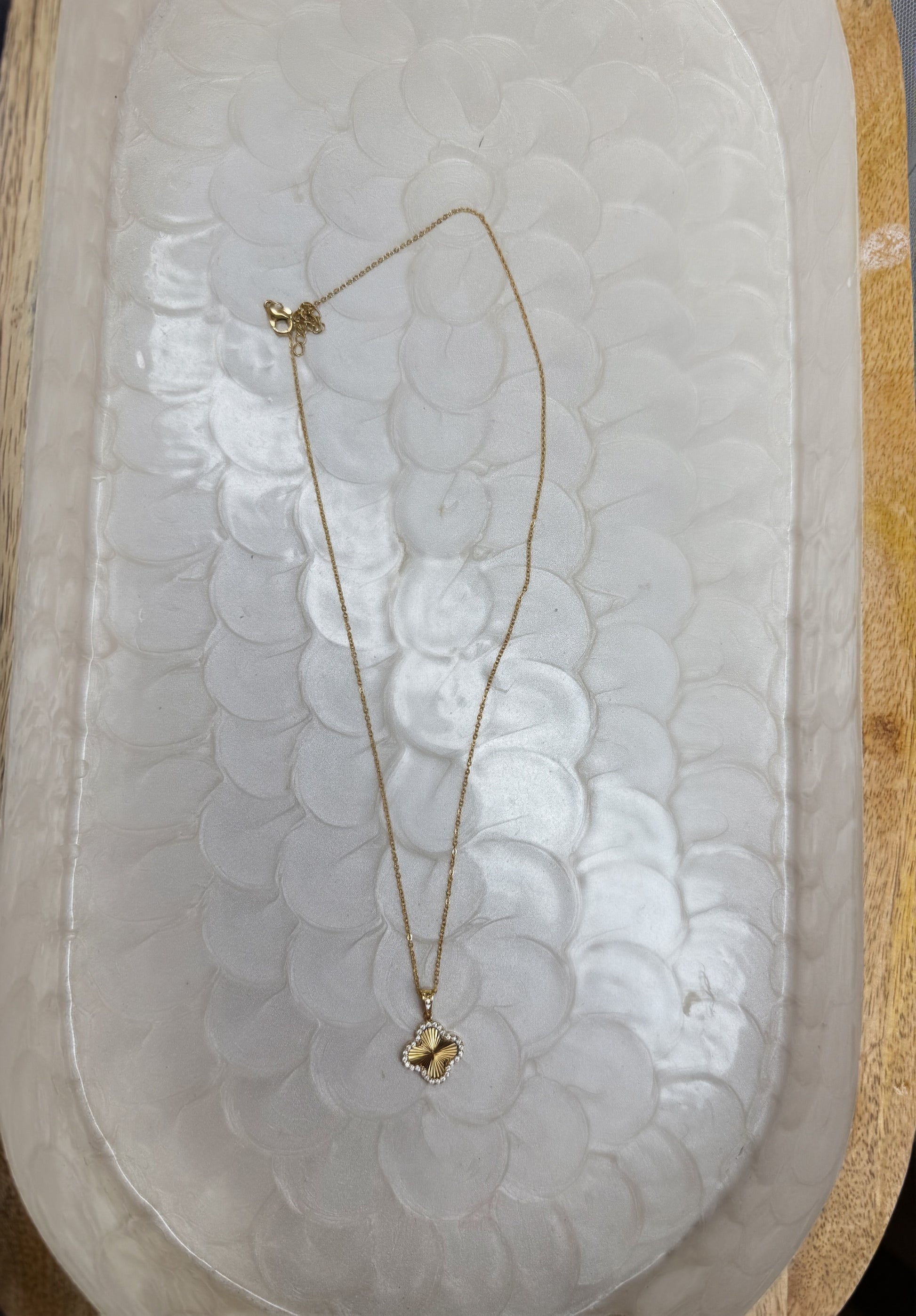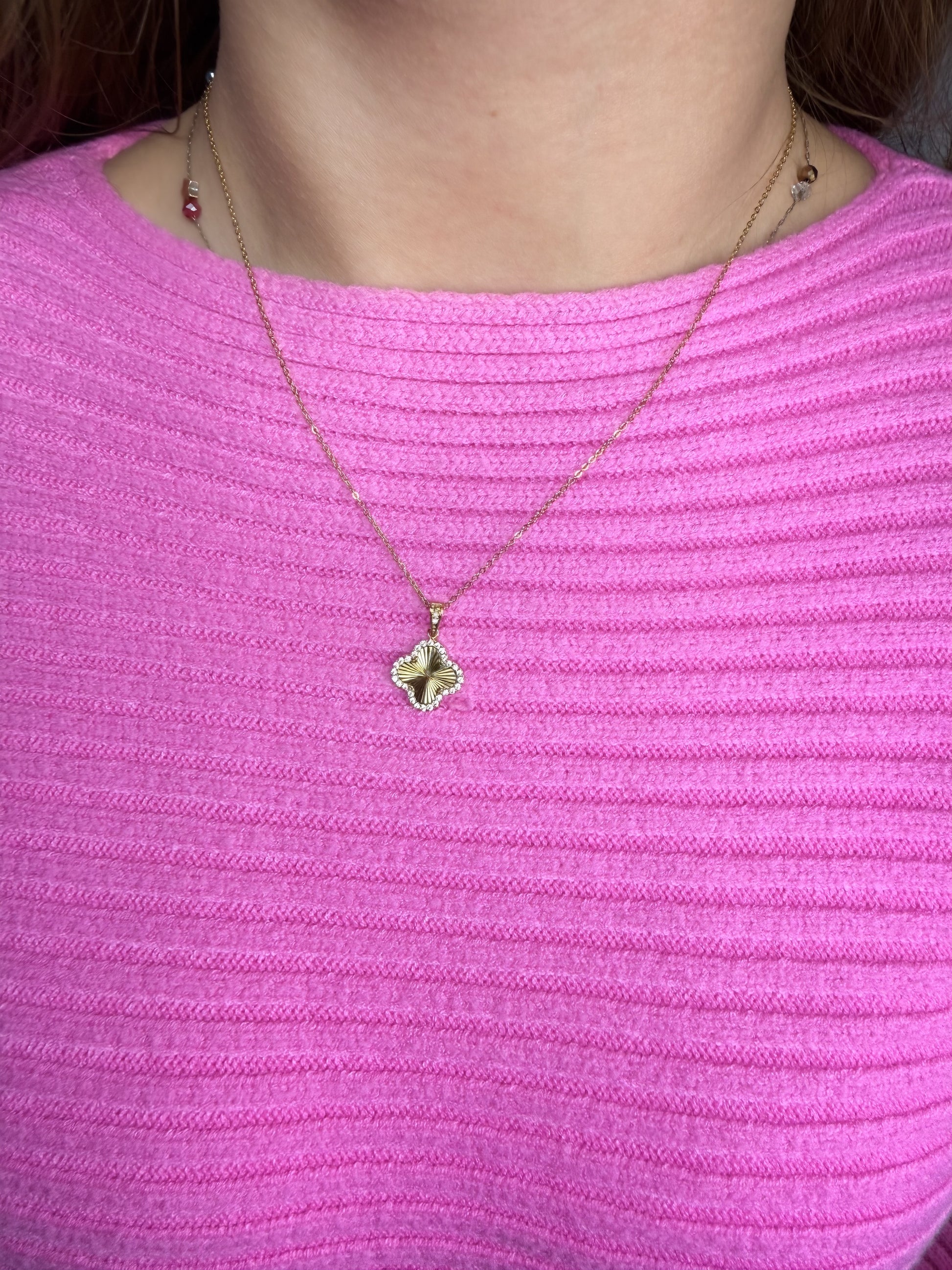 Add a touch of luck and sparkle with the Cambridge Clover Necklace in Gold. Featuring a ribbed gold clover pendant edged with shimmering pave cubic zirconia, this delicate necklace brings charm and shine to any outfit. Crafted from stainless steel and water resistant.