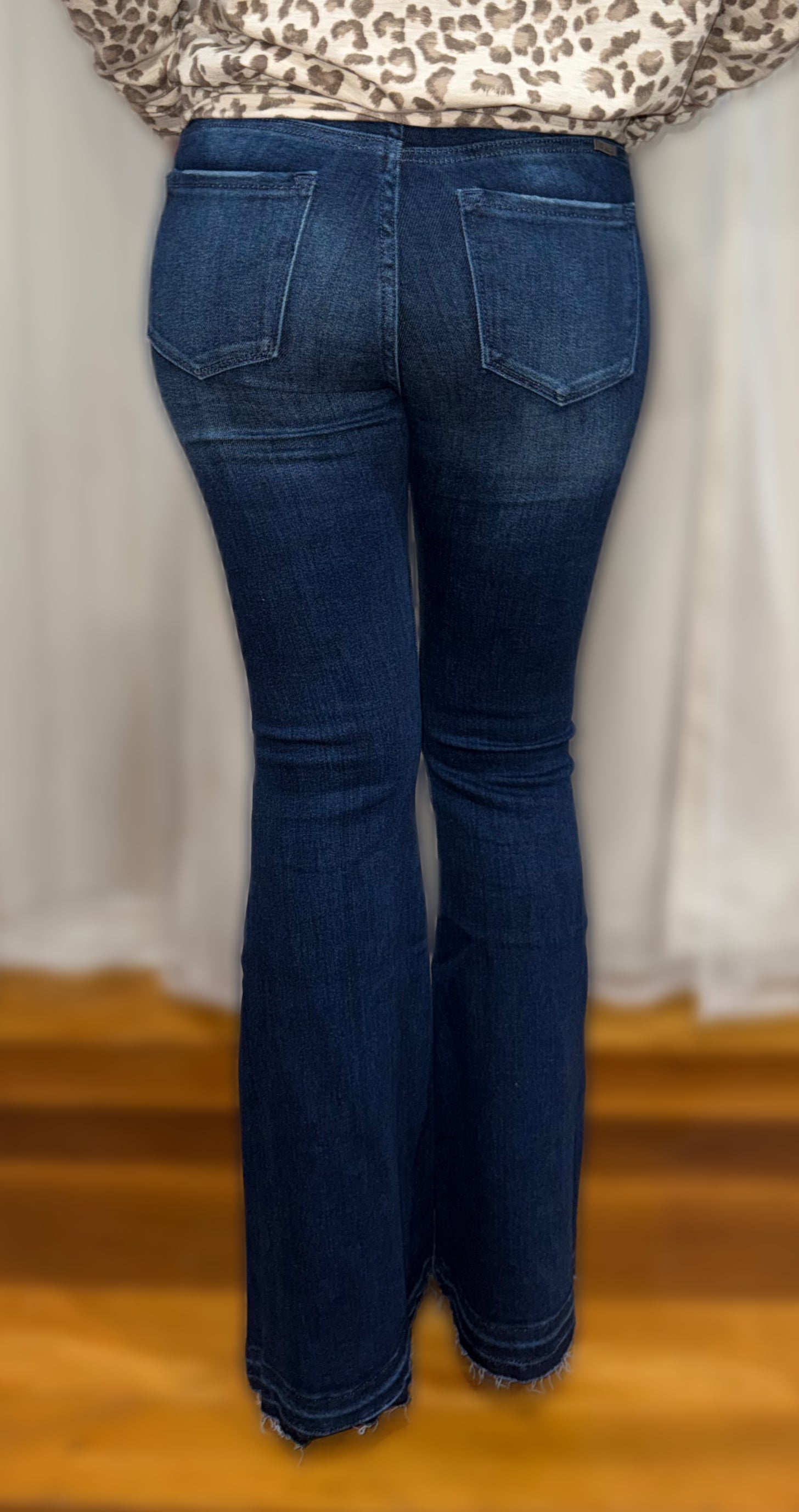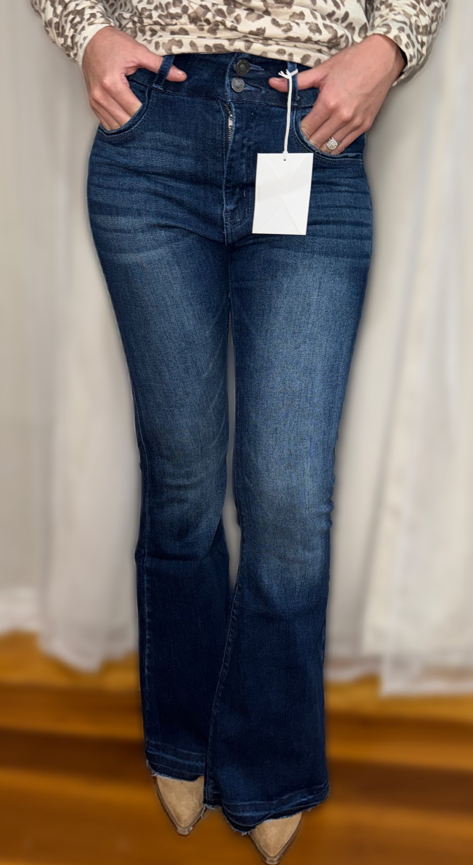 Ultra High Rise Super Flare jeans by Kan Can with a dark wash and flattering stretch. These elongating flares hug in all the right places and give you that legs-for-days look!