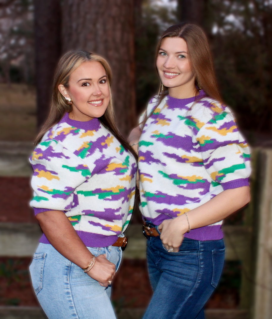 A soft knit short-sleeve sweater featuring a bold Mardi Gras camo pattern in purple, green, and gold. Finished with a ribbed purple neckline and cuffs for a fun, flattering fit that’s perfect for festive days.