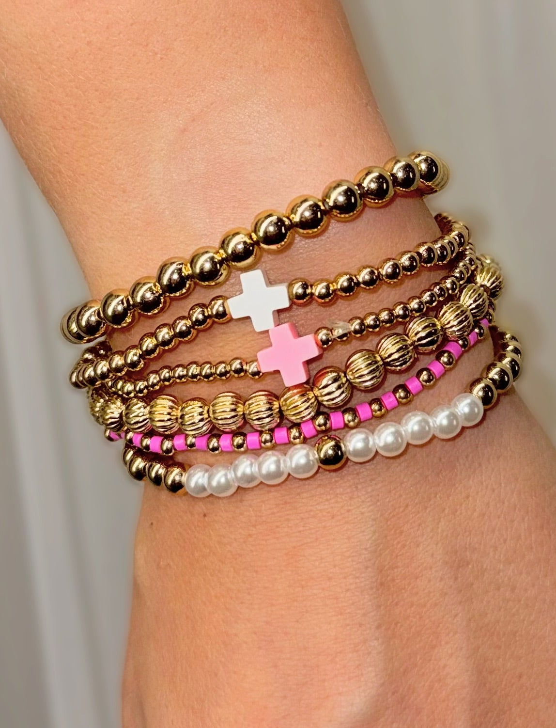 A Beautiful mix of gold, pearls, and soft pink accents- the Grace Stack adds a touch of faith and elegance to any outfit. Perfect for layering or wearing solo for a subtle shine.