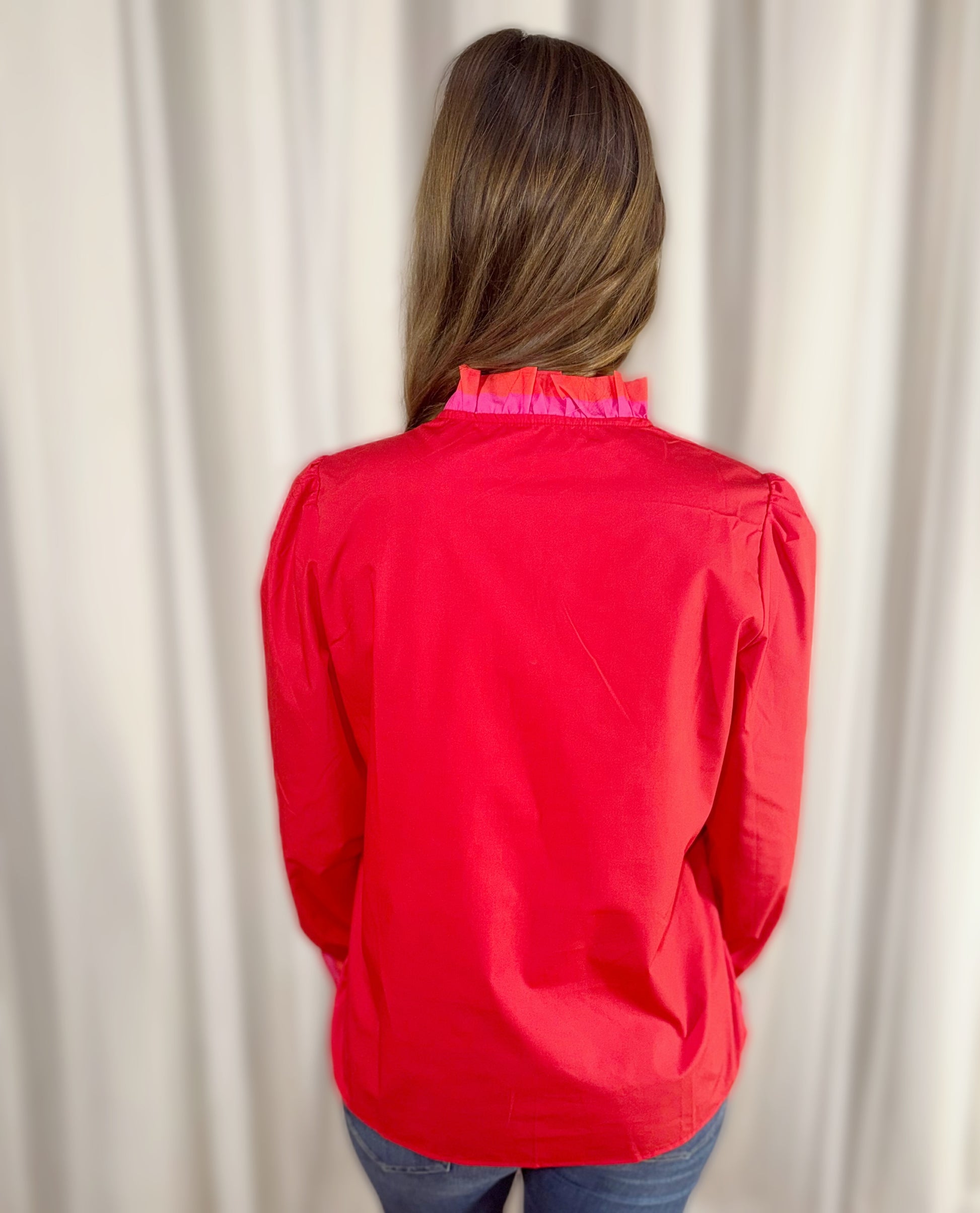 Bright, bold, and feminine- the Candy Kiss Blouse features a vibrant red hue with pink trim and playful ruffle details for the perfect pop of color and charm.